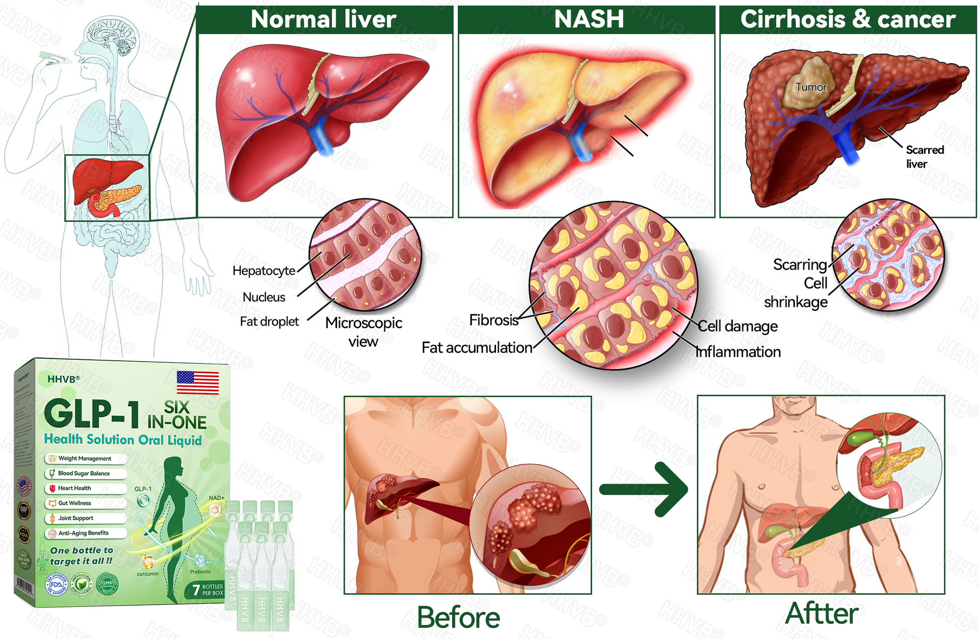Clinically tested by endocrinologist, HHVBยฎ GLP-1 Six-in-One Health Oral Solutionย activation can significantly improve obesity and other health issues within just 7 days.