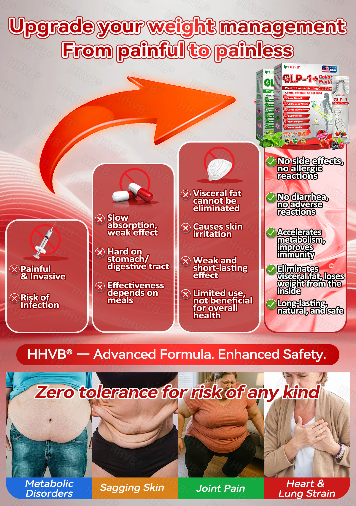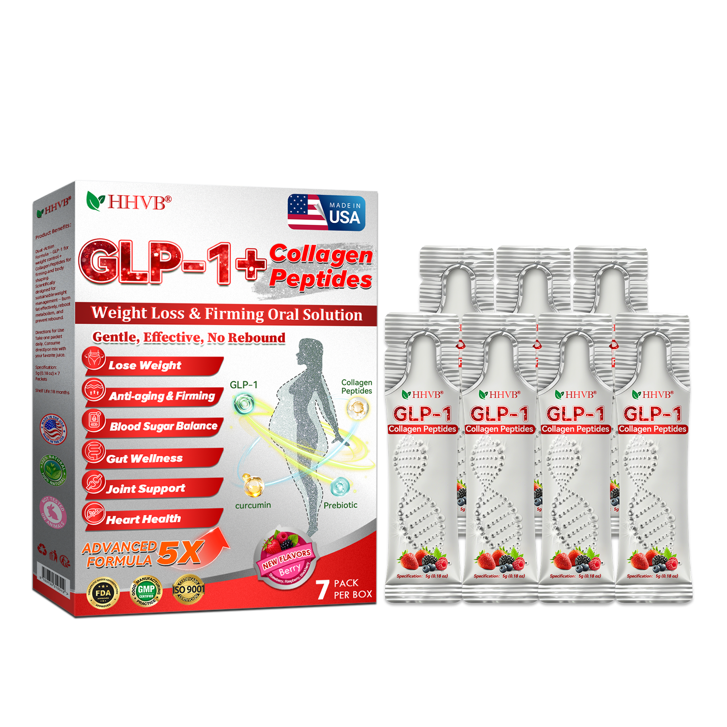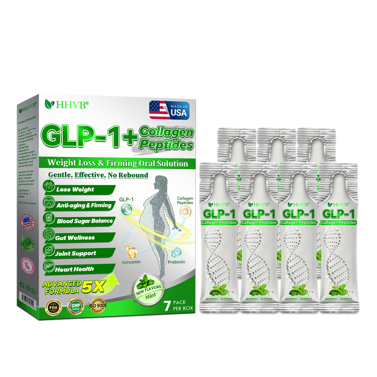 HHVBยฎGLP-1+Collagen Peptidesย Weight Loss&Firming Oral Solution Developed by an international team of metabolic and endocrinology experts, the GLP-1 + Collagen Peptides Oral Solution represents a groundbreaking synergy in weight management and skin regeneration.GLP-1 technology precisely targets the bodyโs metabolic center to regulate appetite, accelerate fat breakdown, and restore energy balance. Meanwhile, Collagen Peptides work deep within the dermis to repair structural loss caused by fat reduction, rebuilding the skinโs support network and visibly improving firmness and elasticity.Clinical studies demonstrate that this dual-action formula delivers measurable resultsโreducing body fat while enhancing skin tightness within a short period of use. It offers a scientifically validated solution for sustainable health, firmness, and long-lasting vitality.
